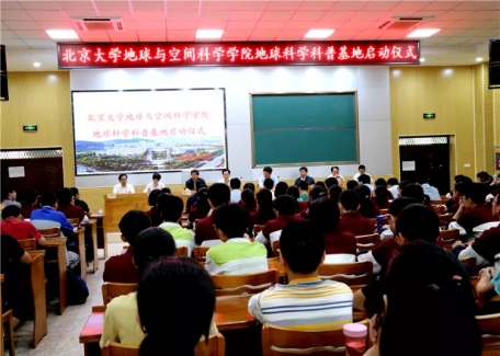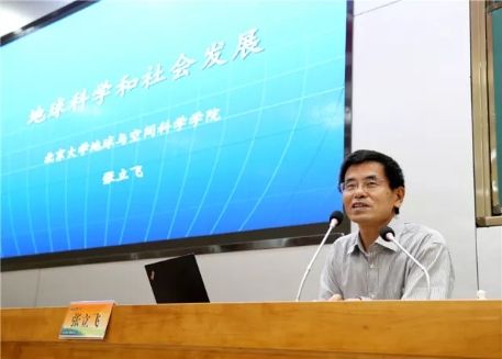 聘任仪式之后,张立飞为现场观众作了题为《地球科学与社会发展》的科普讲座。他首先从宏观上介绍了地球科学的学科体系和发展简史,包括地质学、地貌学、地球 物理学、空间物理学、大气科学等等;之后介绍了地球科学目前的研究进展和前沿问题;而后又重点介绍了地球科学在社会经济中的实际应用。张立飞在报告中介绍 了李四光、黄汲清、谢家荣、丁道衡、卢海龙等北大地学人在大庆油田、稀土探矿、可燃冰试采等国家战略工程中的重要贡献,激发了现场学生们对地学的好奇和向 往。