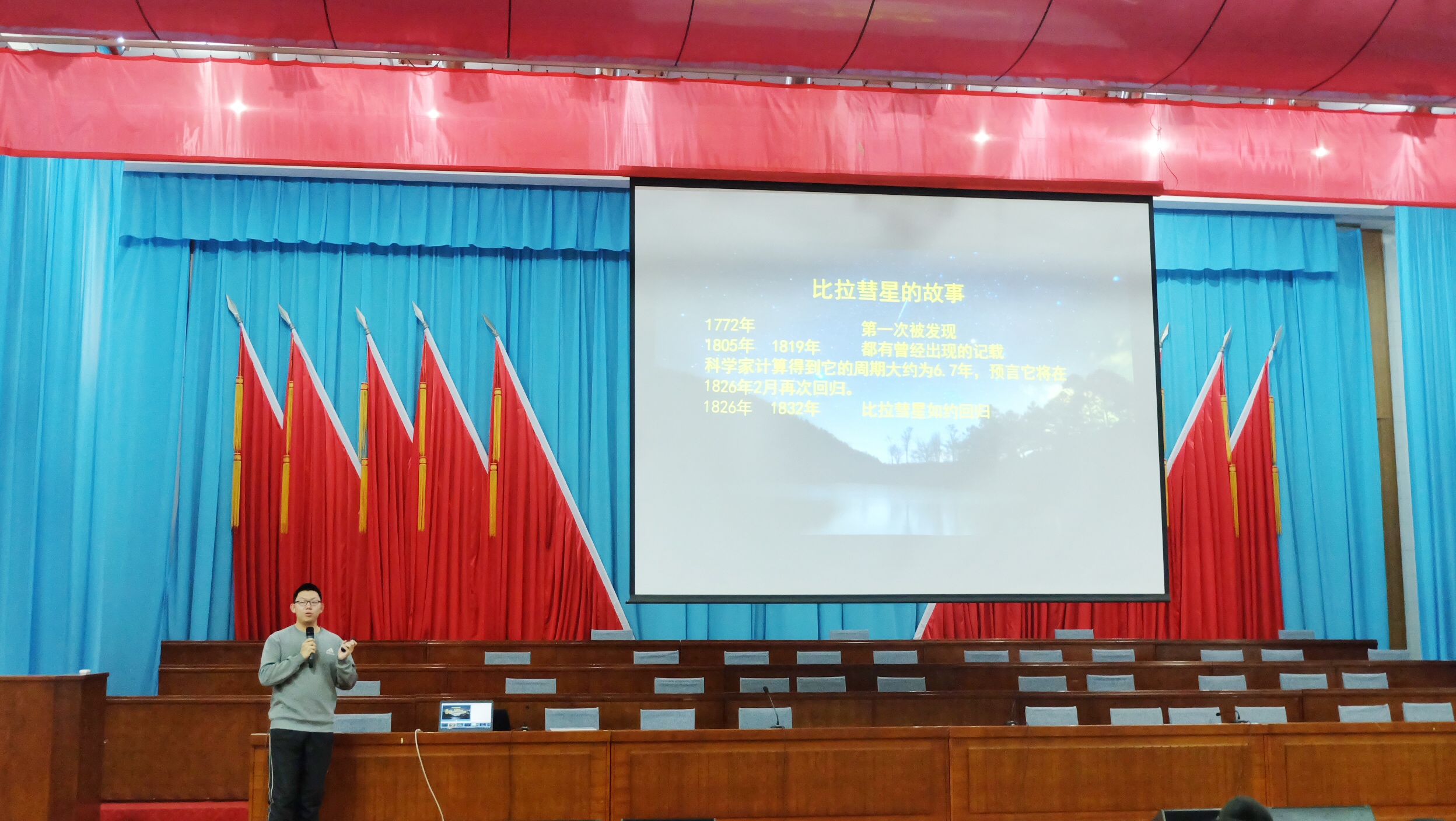 讲师团从多维度为同学们带来宣讲。2016级空间科学与技术专业本科生傅昊博从电影《你的名字》展开,以“夜空中最亮的星”为题,向遵化一中的同学们讲解了空间科学当中的一个小分支:彗星、流星、流星雨的内容,用生动幽默的语言使得刚刚经历两次考试的同学们的心情变得轻松愉悦起来。