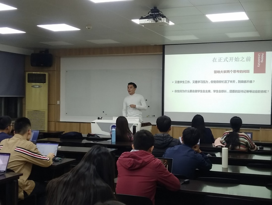 许酌对学生工作体系进行了介绍。首先,许酌分享了自己的学生工作经历,以及学生工作给自己带来的锻炼、成长和收获;接着他介绍了自己对学生工作的理解,学生工作需要协调组织、交流沟通和应急处理能力。学生工作的出发点应该是自己的热爱,由喜爱驱动才能把事情做好。最后他介绍了活动组织方法,准备工作是重中之重,活动流程与环节、观众的定位及人员分工都要先安排好。在活动进行中,各司其职,事后总结,做好收尾工作。