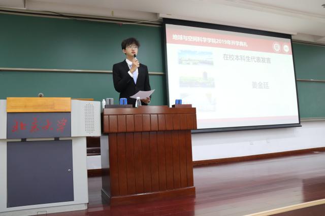 在校本科生代表姜金廷分享了自己初入燕园的想法——决定自己重绘一张白纸。参加本研、学生会、社团和球队,体验各种生活,在自己的白纸上绘画。两年来,地空大家庭始终给予他关心和温暖。这段时间里,在地空所有老师、学长学姐的帮助下,他不断学习和成长,打磨功底,积累经验。姜金廷同学鼓励新生们永远保持追求目标的顽强毅力,保持内心深处的安静平和,应志存高远,脚踏实地。