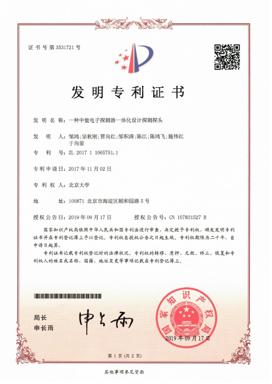 宗秋刚、邹鸿团队申请的三项发明专利《一种中能电子探测器一体化设计探测探头》、《星上数据采集处理方法、系统以及空间粒子探测器》和《空间粒子探测器及其星上数据处理方法》已于近期获得授权。图1为发明专利的授权书。