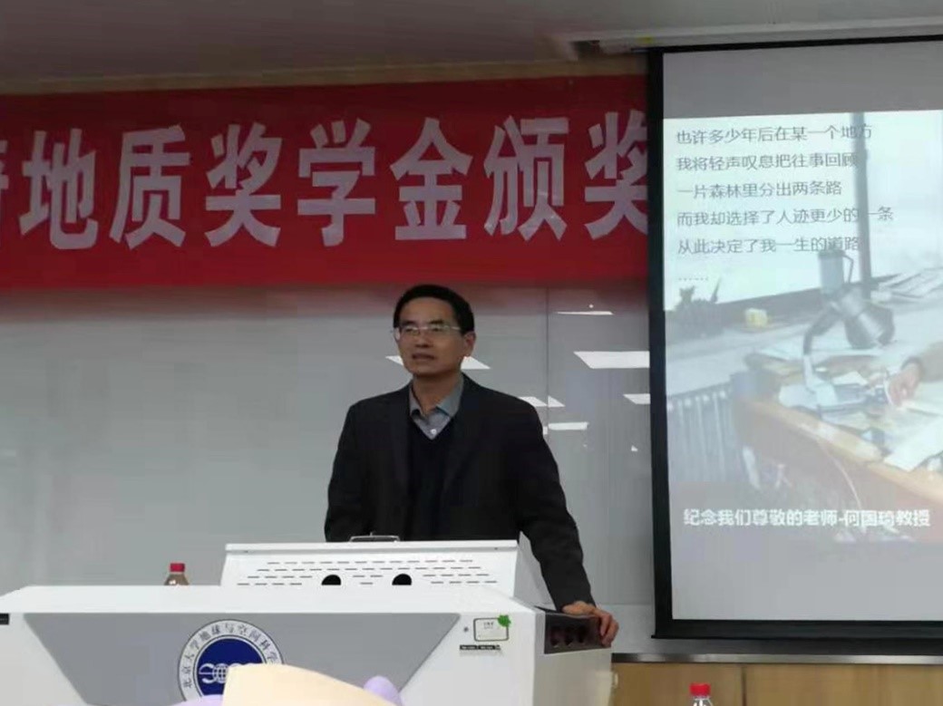张立飞院长随后在致辞中缅怀了何国琦教授并对获奖同学表达了祝贺。他表示,何国琦教授是德高望重、令人景仰的前辈,为北京大学地质学系的发展付出了毕生的心血。他希望获奖同学能够认真学习,热爱地质事业,把前辈的学术精神一代代发扬光大。