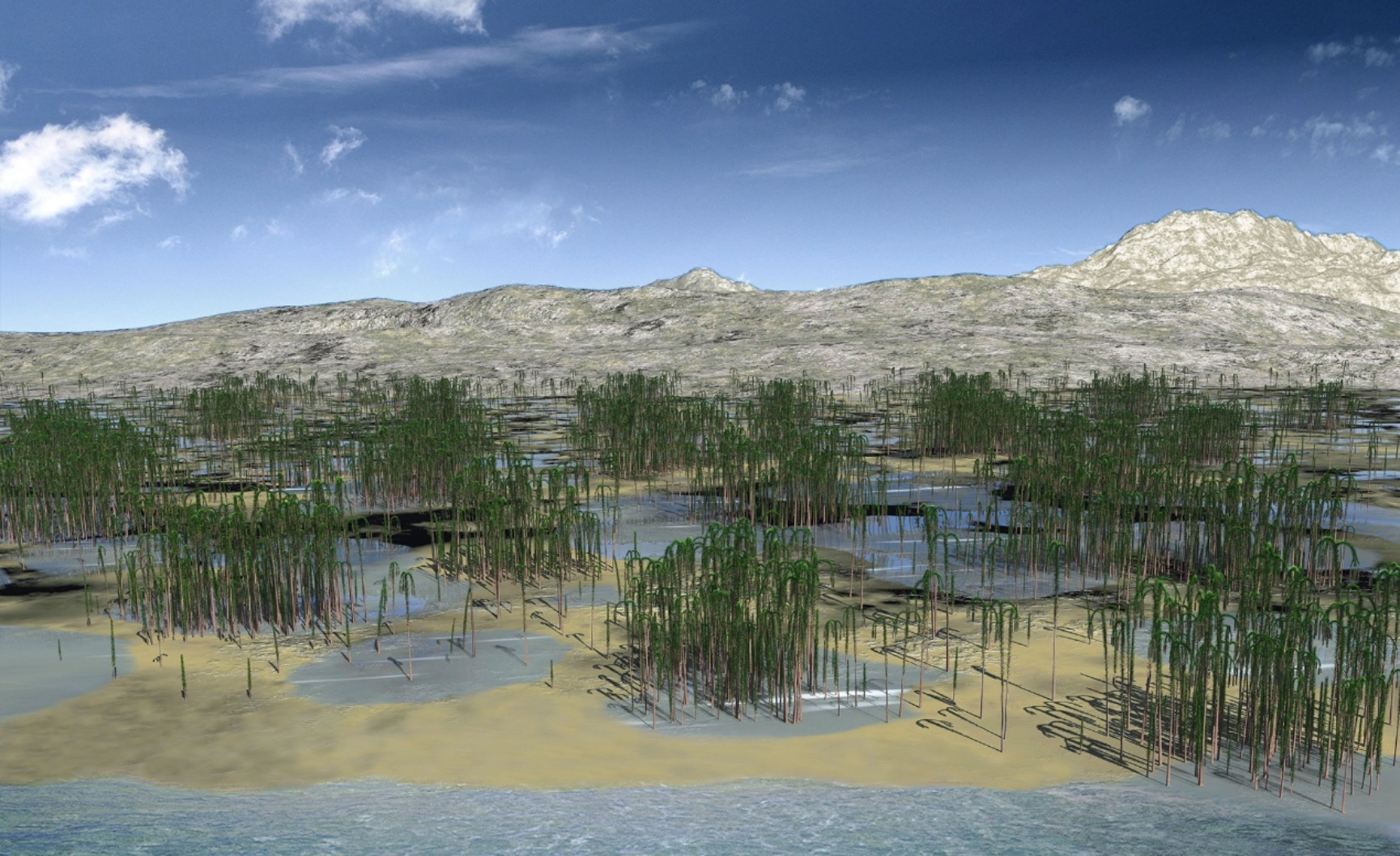 泥盆纪新杭森林景观复原图。森林由小型石松树木---广德木(Guangdedendron)组成,分布在晚泥盆世热带的滨海岸边(邓珍珍等绘制)