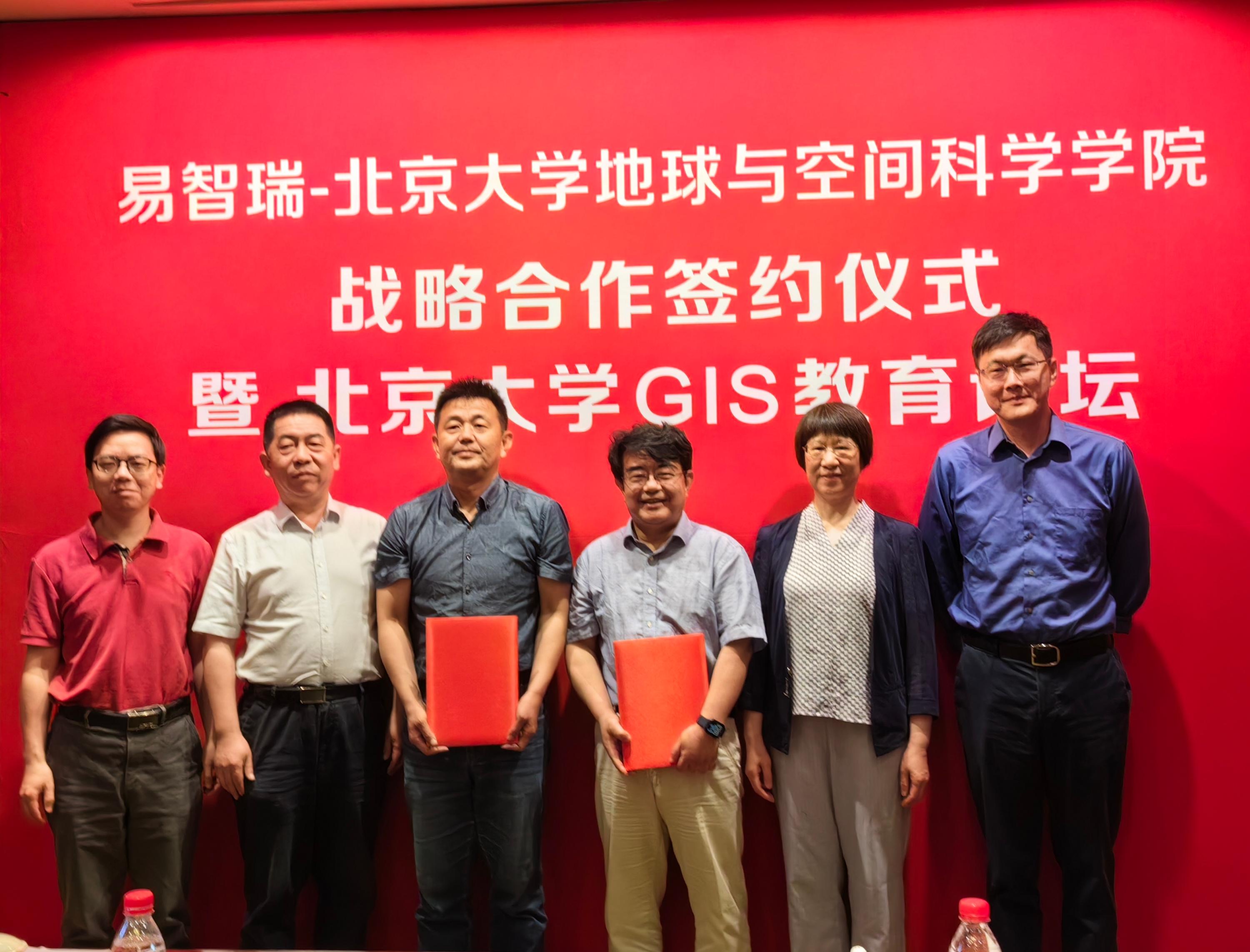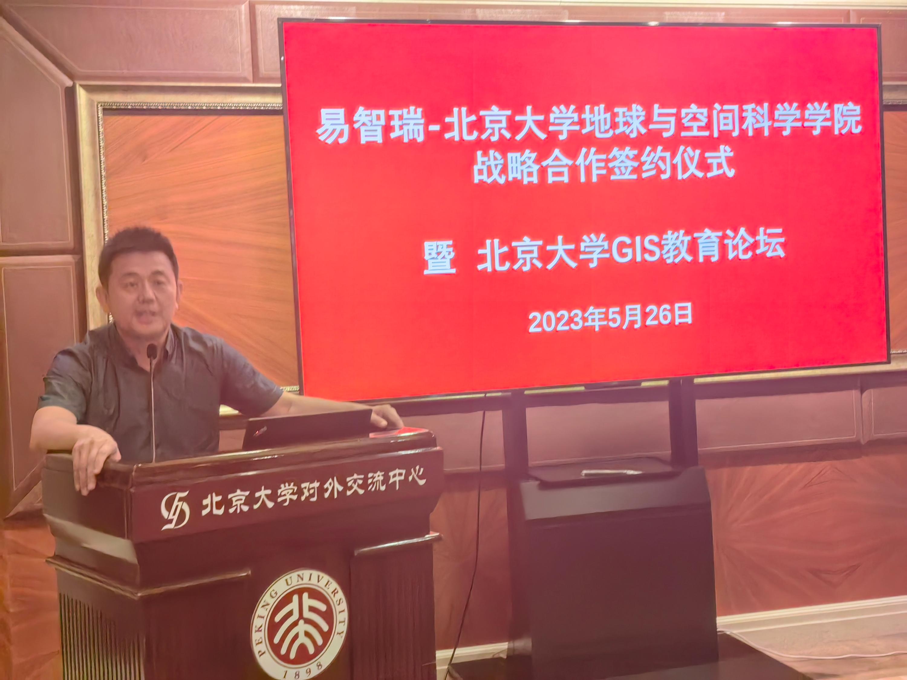 副院长刘瑜教授致欢迎词,并代表学院签署了战略合作协议,此次合作易智瑞软件面向全校师生赠送国产地理信息系统平台最新版本GeoScenePro软件包不少于3年的使用权,用于学校开展本科、研究生实验教学和教师科学研究,同时双方将在时空大数据分析、新媒体地图以及地理信息应用领域加强合作,实现优势互补,利用全球最新技术、最新思路、最新理念,引领GIS教育创新。北京大学教务部刘建波副部长、设备部周勇义副部长、计算中心李庭晏副主任、网信办陈晨副主任、标识办王心阳等相关职能部门领导、以及院系领导共同见证了捐赠仪式。随后,易智瑞信息技术有限公司蔡晓兵高级副总裁开展了“教育为本,智赢未来”的主题报告。