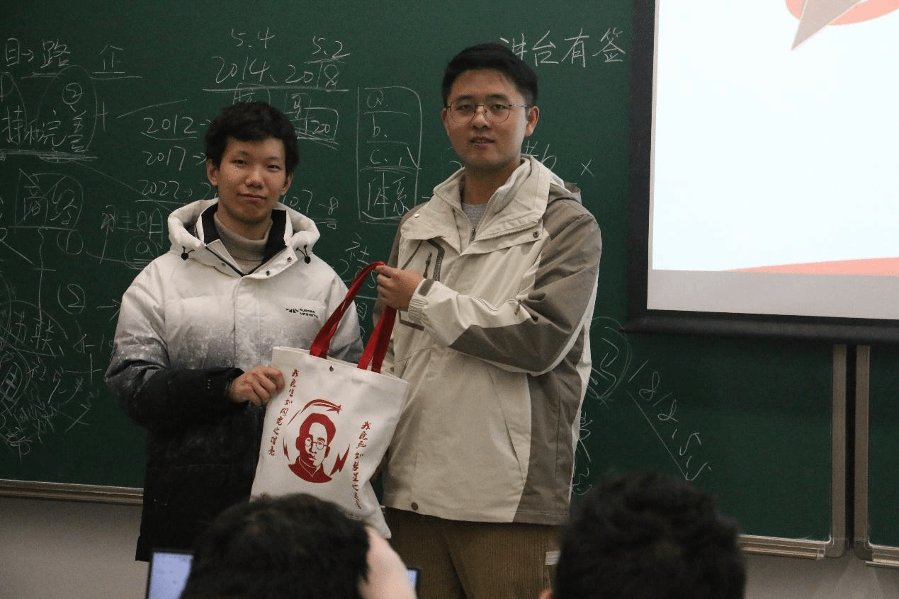 最后,邓玄宇向周勇平赠送了高君宇学生党支部的文创产品作为纪念和感谢,周勇平也对支部成员的理论水平和思考深度表达了高度赞扬。活动结束后大家一起合影留念。