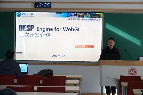 在培训中,来自SDG中心科技创新部的贺留杰介绍了SDG中心的基本情况及最新科研进展。SDG中心数字地球科学平台部胡亚南工程师介绍了三维数字地球的常见技术,并重点介绍了DESP Engine的技术架构。DESP Engine for WebGL是基于HTML5、WebGL技术自主研发的三维平台SDK,利用该平台可以方便地开展科学数据的解析、分析、可视化、服务。SDG中心数字地球科学平台部王康杰工程师通过demo生动地演示SDG中心近年来开展的各种三维应用系统,包括台风灾害监测模拟系统、地震灾情监测评估系统、森林火灾监测模拟系统、流域洪水监测预警系统等自然灾害监测预警等方向的应用。