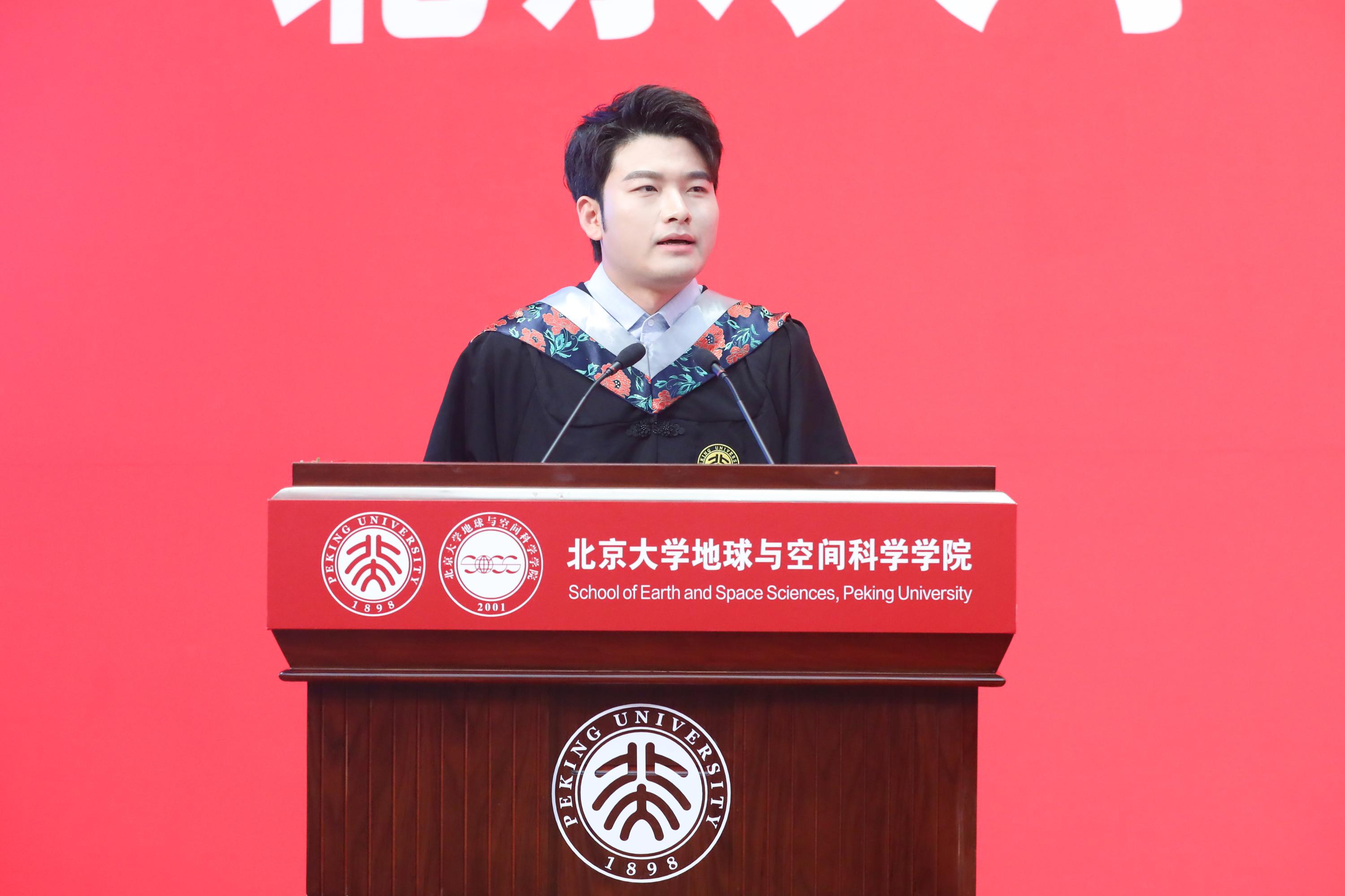 毕业生代表苏奇回顾了他在燕园求学的珍贵记忆与成长历程。他分享了在科研挑战中领悟“脚踏实地,仰望星空”的真谛,感谢师长的培育与同窗的情谊。他表示,无论未来投身哪一个行业,北大地空人都将继续发扬好“爱国、进步、民主、科学”的光荣传统,带着对未知的敬畏与探索的热情,在各自领域继续做执着的“地空追光者”,不负四年的地空青春。