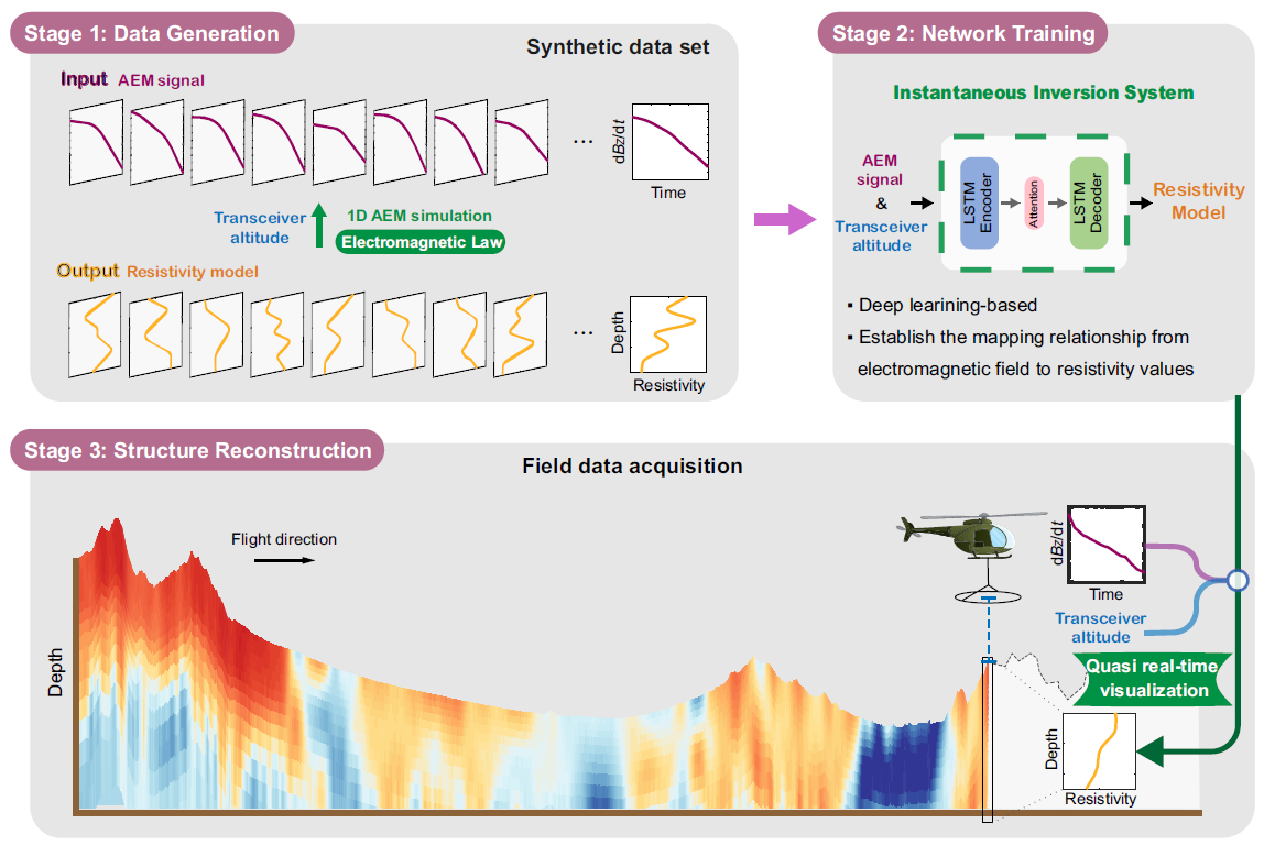 航空瞬变电磁(AEM)法对地形适应性强,采集效率高,是重要的浅地表勘探方法。黄清华教授课题组针对AEM数据反演时面临的计算需求高和多解性等瓶颈问题,借鉴谷歌神经机器翻译系统,利用优化的Long short-term memory (LSTM)网络来构建考虑飞行高度变化的AEM信号与地下电阻率结构之间的映射关系,研发了一套基于深度学习的AEM数据反演高效算法。通过合成数据验证了该算法在复杂电磁噪声环境下的稳定性以及较强的克服局部最优解影响的能力。研究团队还实现了大规模AEM观测数据的反演,获得了与实际资料吻合的浅地表电阻率结构,而计算耗时从数天压缩至秒量级,显著提升了数据反演效率。相关成果可望为AEM观测的准实时成像提供方法支撑。