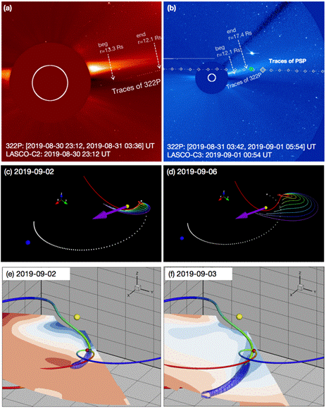 图-1. 关于帕克太阳探针(PSP)和322P彗星在内水星轨道区域的交会研究。(a & b)分别是LASCO-C2和C3日冕仪观测到的322P彗星的运动的痕迹。(c & d) 针对322P彗星释放不同粒径大小的尘埃粒子受力和运动的模拟仿真。(e & f) 针对322P彗星尘埃等离子体与背景初生太阳风相互作用的磁流体力学模拟结果。(图修改自He et al. (2021))