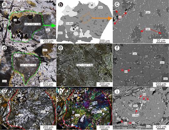 1:(a),冀东太古宙橄榄岩中石榴石假象。(b-c),(a)中石榴石假象局部放大图。(d),石榴石假象与出溶的辉石伴生。(e)- (f),石榴石降压分解形成的辉石和尖晶石蠕虫状交生矿物组合。(g-(i),石榴石假象被橄榄石包围,呈粒状变晶结构。