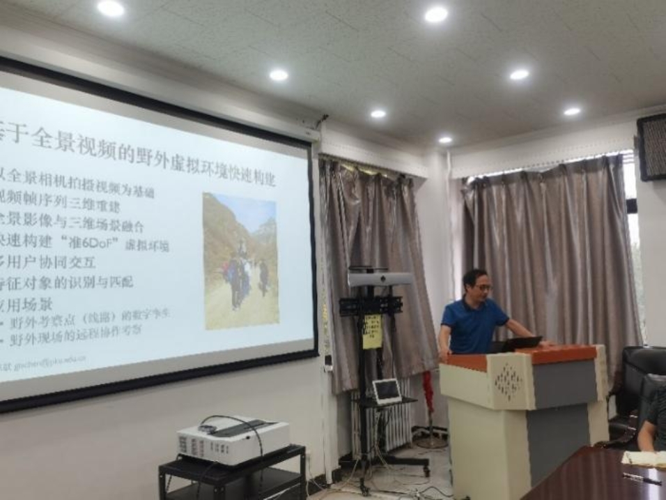 教授陈斌以“人工智能在虚拟地理环境中的应用”为主题,介绍了课题组在野外虚拟环境快速构建、高精度虚拟地形生成、化石识别与分类预测方面的研究。