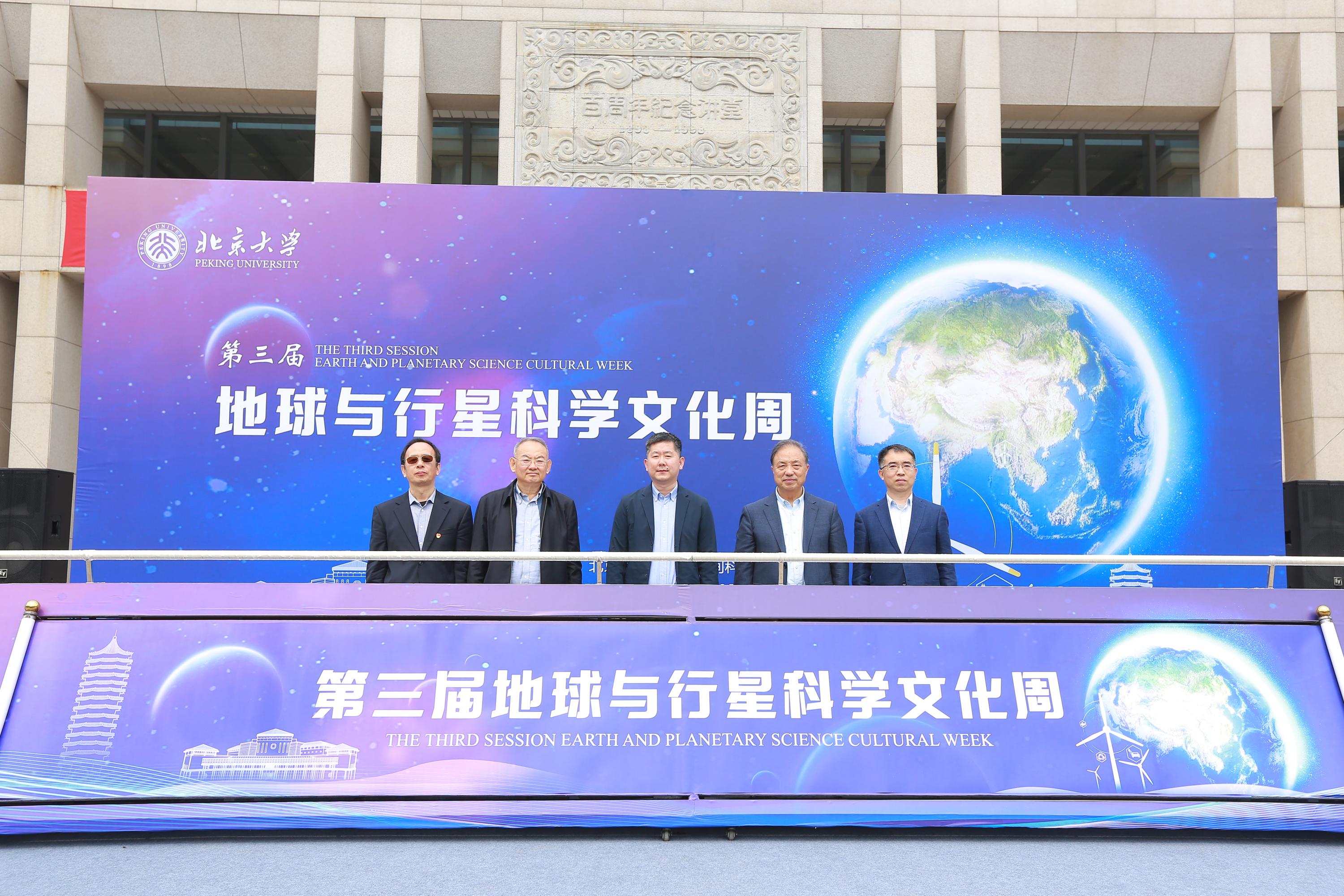 朴世龙、郭华东、金之钧、黄健、李培军走上舞台,共同启动北京大学第三届地球与行星科学文化周。