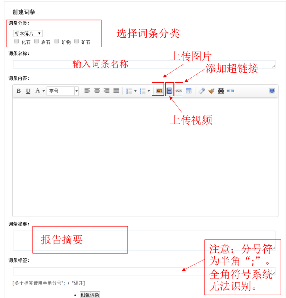 (5)填写“词条标签”:输入便于检索的关键词,注意词之间用英文半角分号