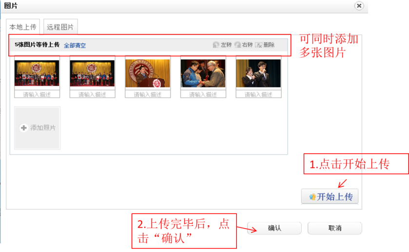 将加好水印的文档保存为图片格式(推荐使用JPG、PNG格式),注意图片格式不要过大,大小为500k左右合适,推荐尺寸:650*458(以实际图片尺寸为准,可微调),尺寸适宜,不要超过浏览页面。在编辑词条页面点击上传图片按钮,选择“本地上传”—“添加图片”,可一次性选择多张照片。选择完毕后点击开始上传,等待所有图片均上传成功,点击确认即可。