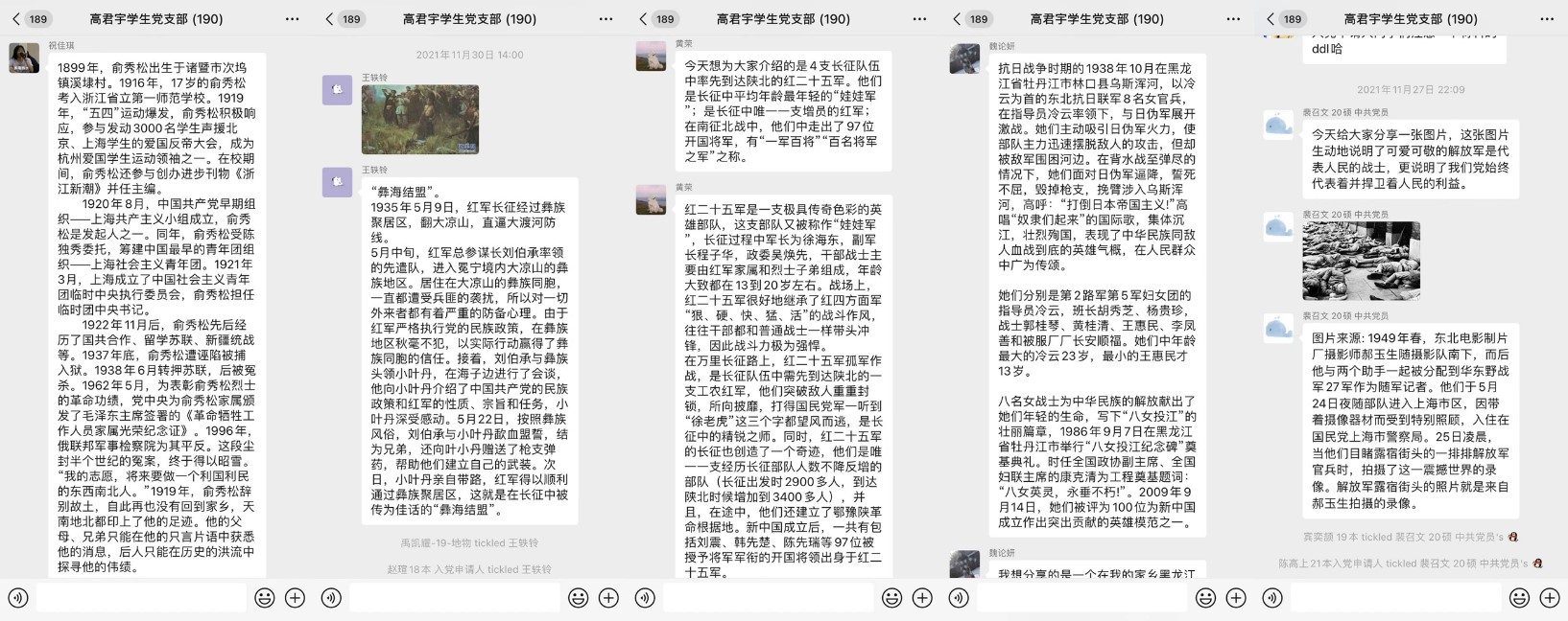 自11月22日起,为传承红色基因、激发奋进精神,高君宇学生党支部仿照团中央的“青年大学习”,开展了主题为“每天先进一点点”的党员小学习活动。支部中的党员依照排班,每日在微信群中分享一则党史党建党纪党规方面的小故事、小知识,为支部成员提供趣味性和知识性并重的日常性理论学习小材料。