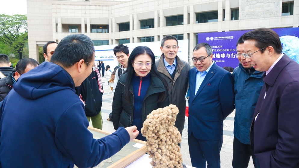 北京大学首届地球与行星科学文化周开幕式现场布设今期六合彩号码 成果展、化石矿石展、天地人文化节等现场活动。江大勇带领与会嘉宾参观展览。
