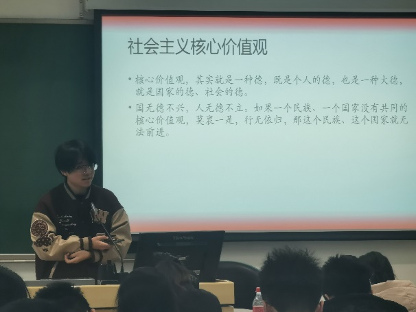 第九组围绕习近平总书记2014年5月4日在北京大学师生座谈会上的讲话《青年要自觉践行社会主义核心价值观》具体内容,联系习近平总书记在纪念五四运动100周年大会上的讲话和其他相关内容,带领大家深入学习了五四精神和社会主义核心价值观具体内涵,并结合四书中相关内容阐释了古今核心价值观的异同,帮助同学们从中汲取养分,实现精神层面的成长。
