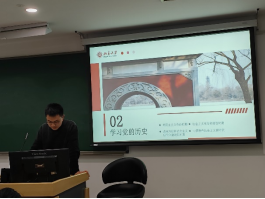 第六组结合寒假的调研活动中与抗日战争相关的场所各位积极分子开展的参观学习,以“抗战胜利的坚固支撑——中国共产党领导下的敌后战场”为主题,从背景、主要战役和评价三个角度进行深入分析。从全局的角度带领大家回顾了中国共产党带领人民群众在艰苦卓绝的时期与侵略者奋力抗争的历史,展示了敌后战场为抗日战争的最终胜利做出的巨大贡献。