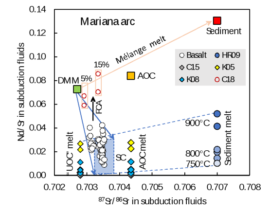 图4 板片熔体、混杂岩熔体与马里亚纳岛弧玄武岩的对比。板片熔体和混杂岩熔体的Nd/Sr比值根据实验数据计算得到。蓝色方框代表推算的俯冲组分,可以由沉积物熔体、蚀变洋壳熔体和未蚀变洋壳熔体的混合得到。