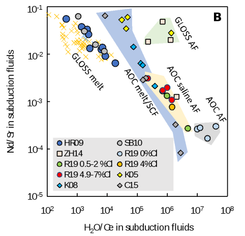 图3 来自沉积物或者洋壳的熔体、超临界流体和富水溶液中的微量元素含量与原始岛弧玄武岩的对比,以Nd/Sr与H2O/Ce为例。黄色十字代表全球原始岛弧玄武岩成分。不同图例代表根据不同实验数据计算得到的结果。