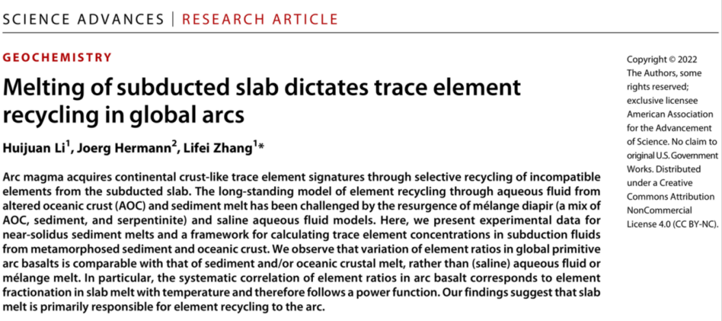 最近张立飞教授课题组与瑞士波恩大学Joerg Hermann教授合作,在俯冲带岛弧岩浆成因岩浆方面研究取得重要研究进展,提出了岛弧玄武岩浆俯冲板片熔融新模式。该项成果于2022年1月12日发表在Science Advances上(Li et al., Sci. Adv. 8, eabh2166 (2022) 12 January 2022, //doi.org/10.1126/sciadv.abh2166),李慧娟副研究员是该文的第一作者,张立飞教授是通讯作者,北京大学为第一完成单位。该项研究获重点研发计划项目(2019YFA0708501)资助。
