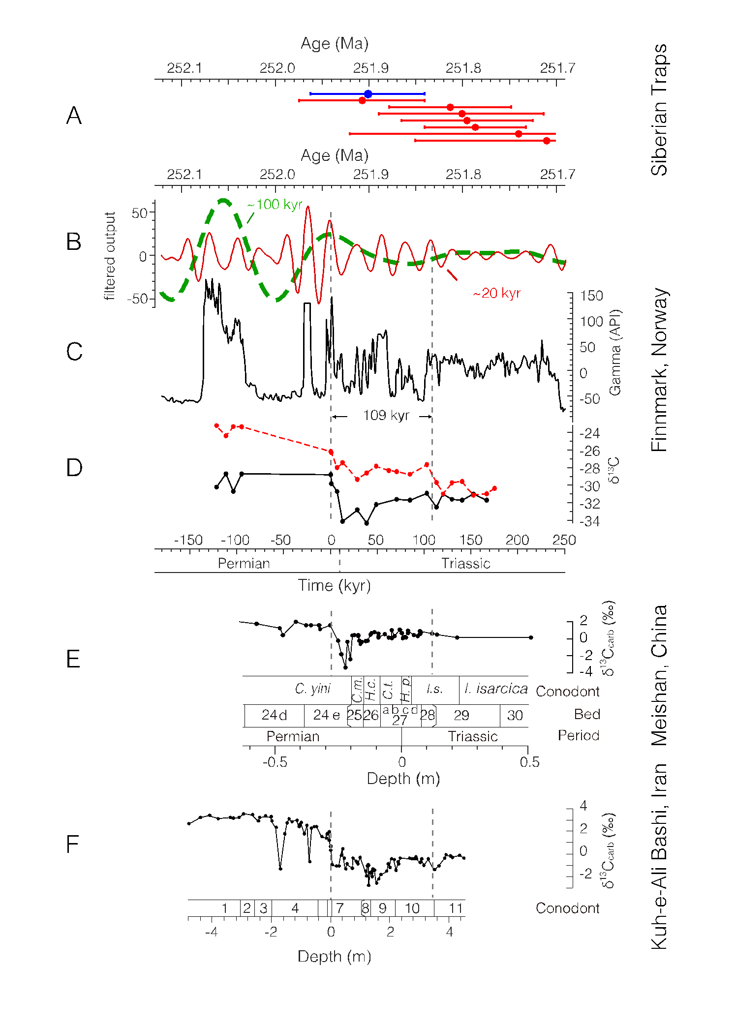 2008级硕士班)及挪威奥斯陆大学Wolfram M. Kürschner教授等人,对晚二叠世生物灭绝事件进行了系统的有机地球化学、天文年代学以及地球系统模型的研究,认为西伯利亚大火山岩省快速释放大量的CO2导致了二叠纪末生物大灭绝。研究成果于近日发表于美国国家科学院院刊(PNAS)。