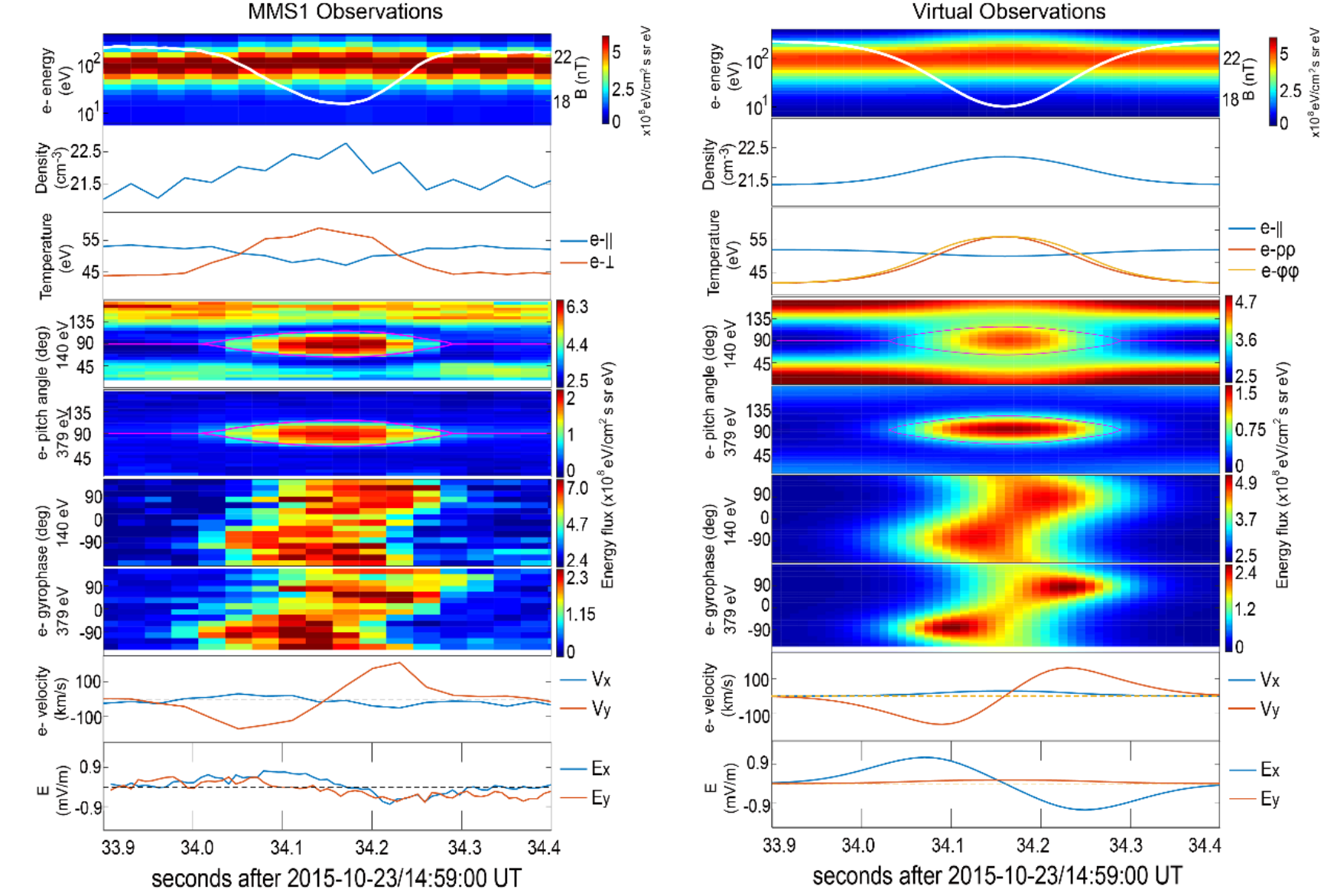 图二:磁洞在质子回旋(左)与电子回旋尺度(右)上的磁场分布