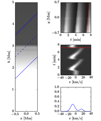 太阳大气中激波传播的正演模拟结果。左侧为分层大气密度随高度的变化及其受激波传播的扰动,图中的倾斜蓝线为视线方向,两条蓝色实线为仿真光谱仪前端的狭缝能观测的范围。右侧从下到上依次为狭缝中间位置的合成光谱轮廓的时变特征、狭缝中间位置的合成光谱轮廓的时间堆叠图、沿着狭缝方向的光谱强度的时空切片。