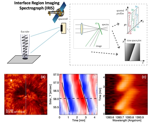 天基太阳过渡区成像光谱仪(IRIS)对太阳大气及其中激波的成像和光谱的同时观测。下图左图为对日面太阳黑子的成像观测,中图为光谱分析得到的多普勒频移的时空切片特征,右图显示中图横虚线位置的光谱轮廓随时间的变化特征。下图事件在Tian et al.(2014)中也曾报道。