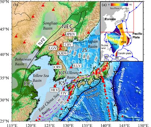 图 1 (a)东亚地区构造环境。蓝色锯齿线表明了板块边界与板块运动方向。彩色图为菲律宾海板块的海洋板块年龄。红框表示(b)图的区域。(b)东北亚地区的主要构造特征。红色火山符号表示晚新生代板内火山。红色小三角形表示岛弧火山(与板内火山区别)。带白色锯齿的黑色线表明了日本海沟和琉球海沟的板块俯冲方向。紫色虚线及其上的数字表明了太平洋板块和菲律宾海板块俯冲板片的位置与深度。黑色细线表示郯庐断裂带(Tan-Lu Fault Zone,TLFZ)。