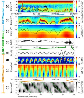图2:离子与宏观尺度的超低频波(ULF wave)和微观尺度的电磁离子回旋波(EMIC wave)之间的跨尺度相互作用。这一相互作用导致能量直接从宏观尺度输运到微观尺度。此图为Magnetospheric Multiscale卫星地球磁层的观测。