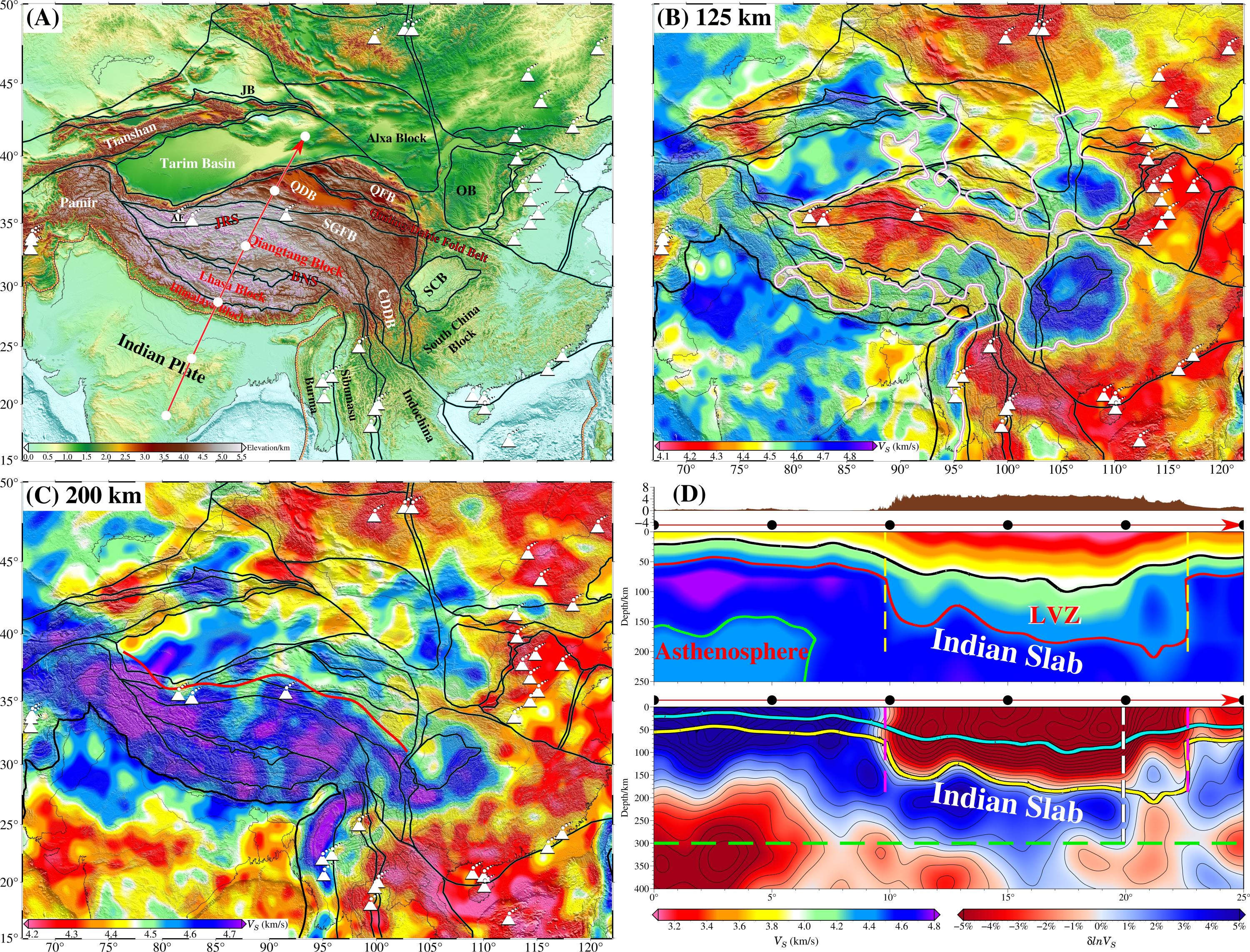 图1印度-欧亚碰撞形成的青藏高原深部地震波成像结果。(A)青藏高原及其周边地区地表地形和主要构造特征。(B)和C)深度 125 和 200 公里的各向同性剪切波速度分布图。在图(B)中,青藏高原底部下方的低速异常以白色粗线条勾勒出来。在图(C)中,根据横波速度变化以红色粗线标出了俯冲印度板块的北部前缘。(D) 与青藏高原高海拔、低起伏地形的形成和维持相关的低速岩石圈结构(上);青藏高原下方俯冲印度岩石圈的几何形态和结构特征 (下)。