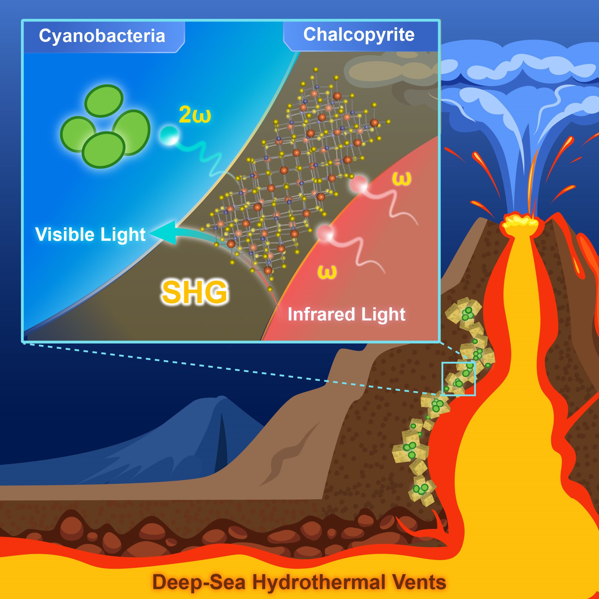 图3 地热红外光通过矿物SHG效应转化为可见光,支持深海蓝细菌产氧光合作用示意图